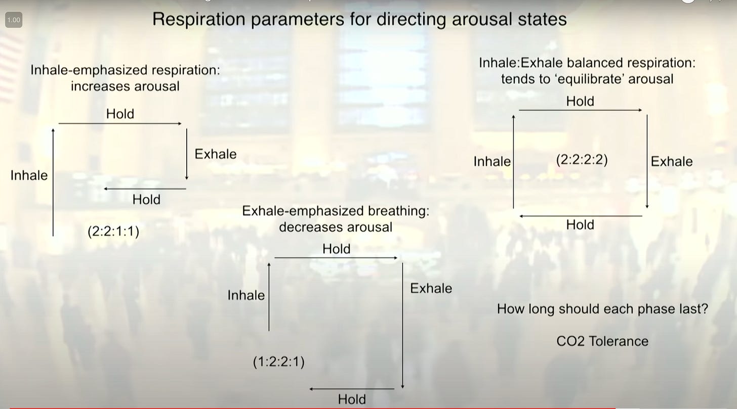 [*To be honest, a 1:1:2:2 ratio emphasizing the exhalation hold was more intuitive to me, but I’ll just share what his slides note. In most interviews, Huberman doesn’t really emphasize the holds, but recommends doing 2 inhalation sniffs followed by a long exhale (physiological sigh) to calm the nervous system down quickly.]